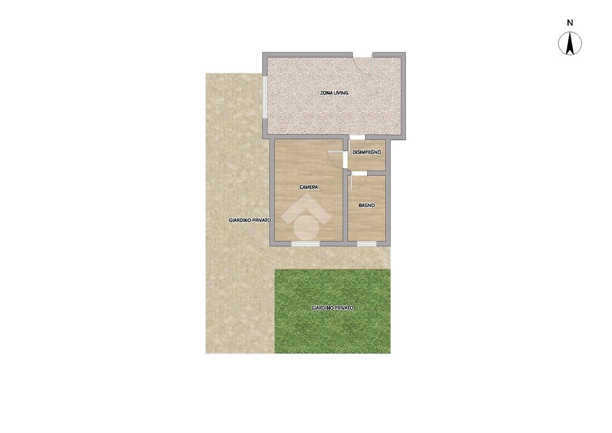 L’ appartamento risulta essere così composto : ingresso diretto nella zona giorno con soggiorno e cucina a vista, proseguendo mediante disimpegno, si accede alla zona notte con una camera da letto e un servizio finestrato, il tutto circondato da giardino privato angolare e piastrellato.
