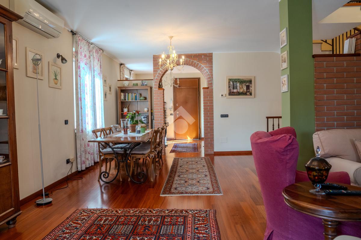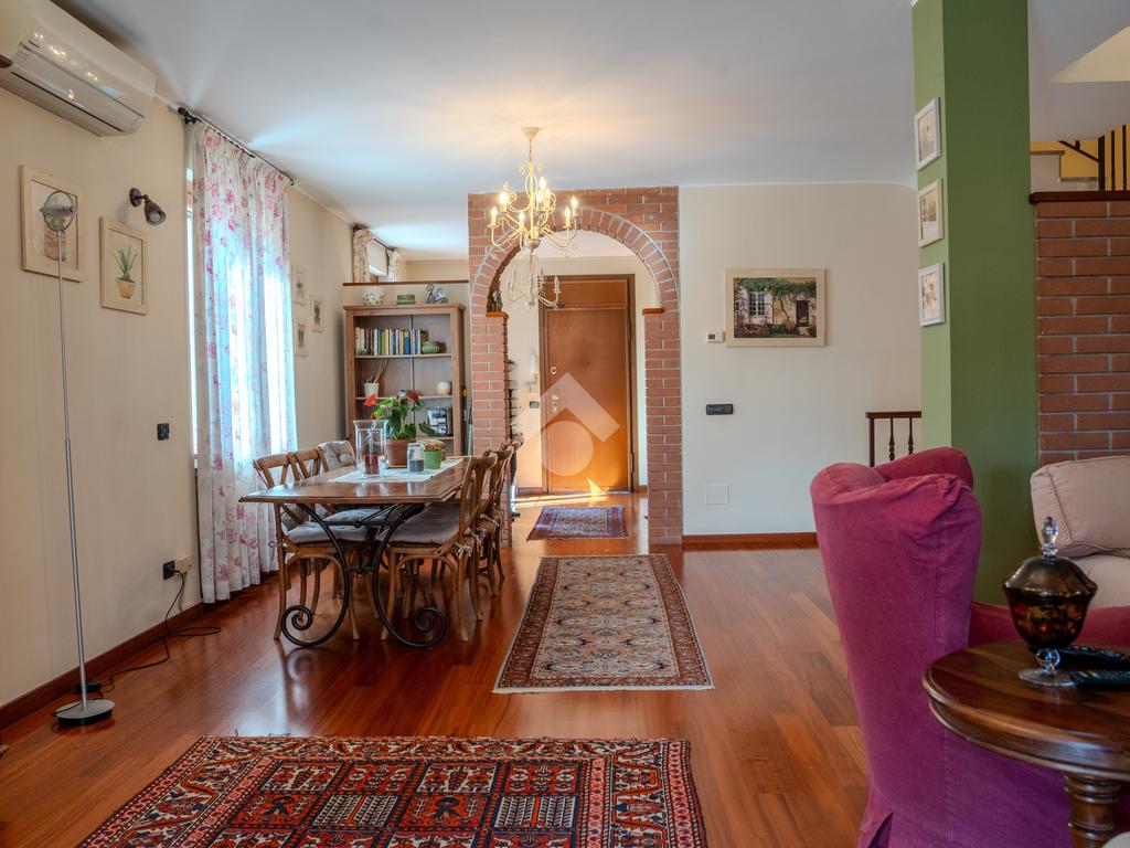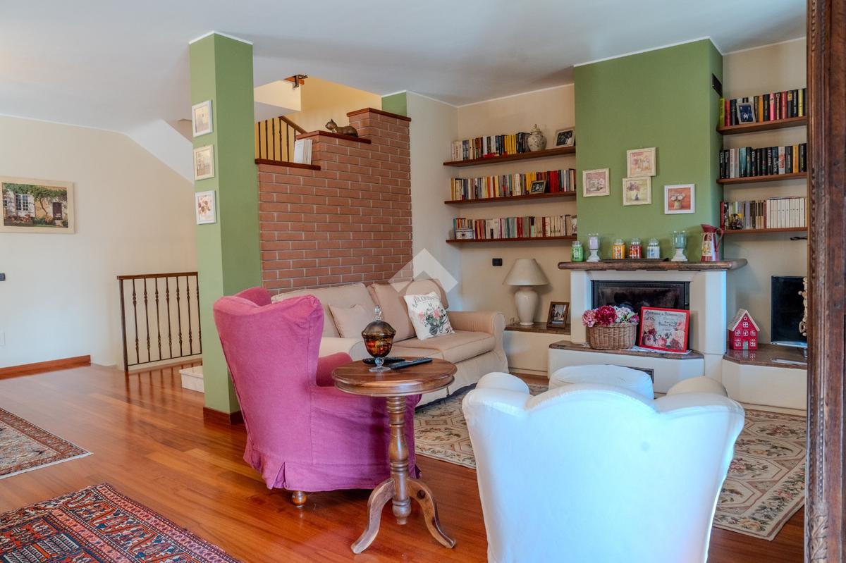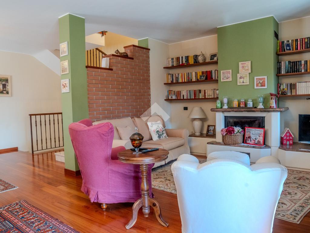 L’ingresso al piano terra si apre su un luminoso soggiorno di generose dimensioni, valorizzato da tripla esposizione che garantisce un’eccellente luminosità naturale durante tutto l’arco della giornata. L’ambiente, rifinito con parquet di pregio, è reso particolarmente accogliente dalla presenza di un suggestivo camino e dettagli architettonici come arco in muratura. Presente inoltre impianto di climatizzazione caldo/freddo.